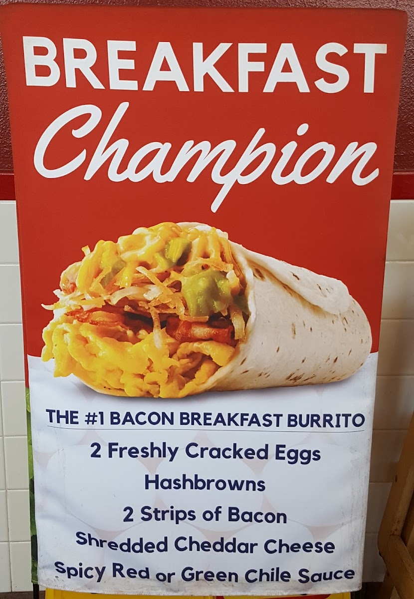2 Fresh Eggs, Choice of Bacon or Sausage, Cheese, and Green Chile on a Gourmet Bun